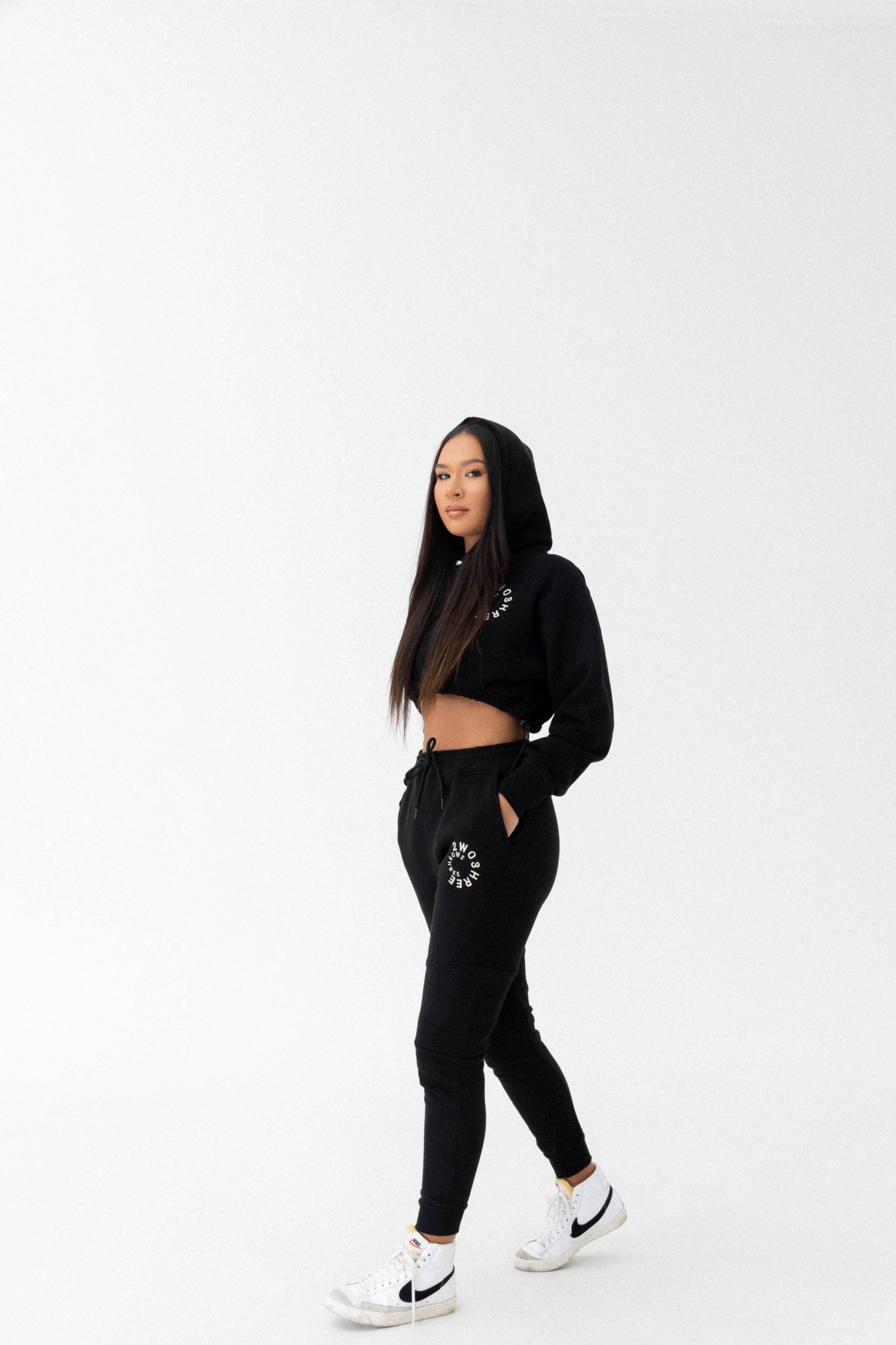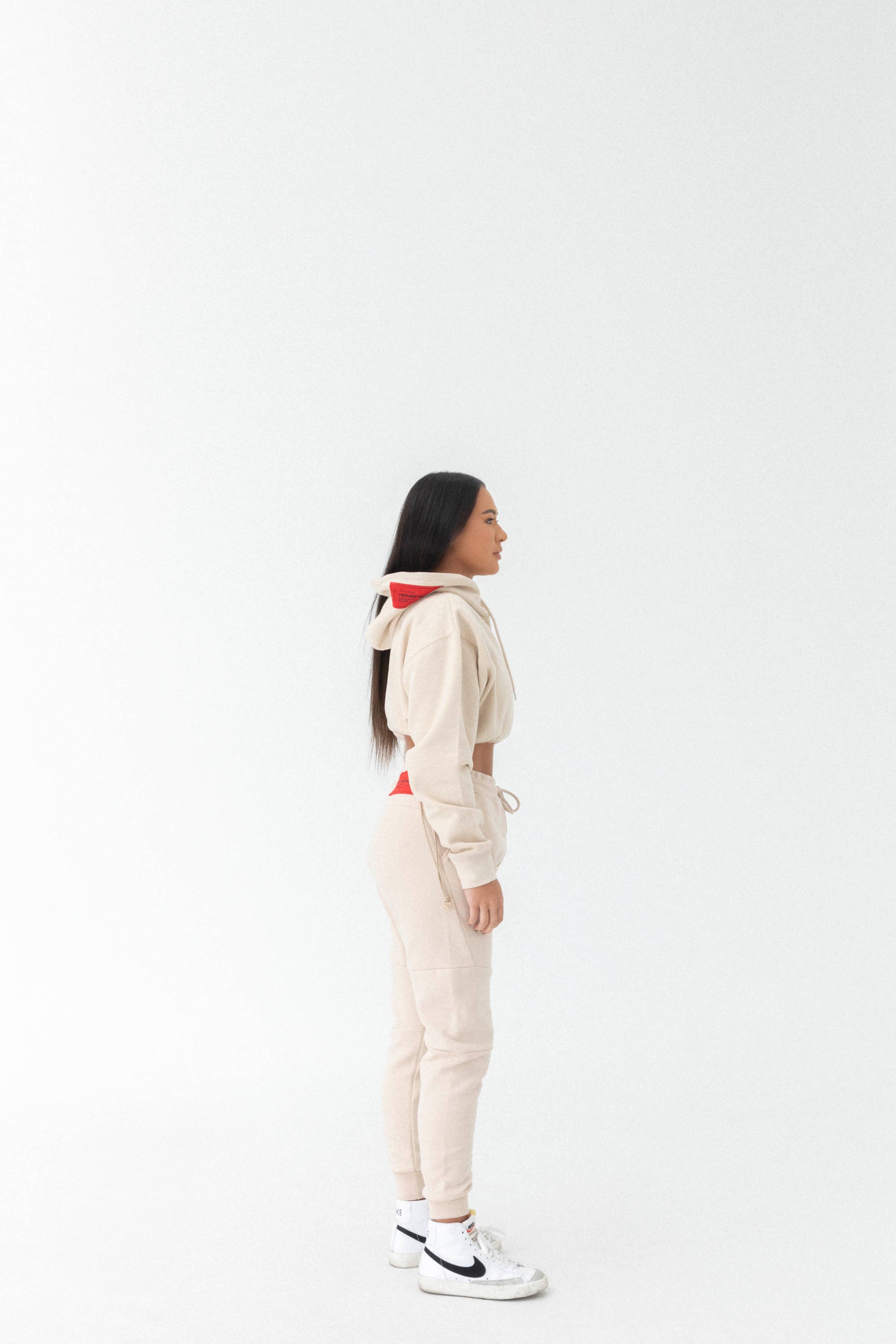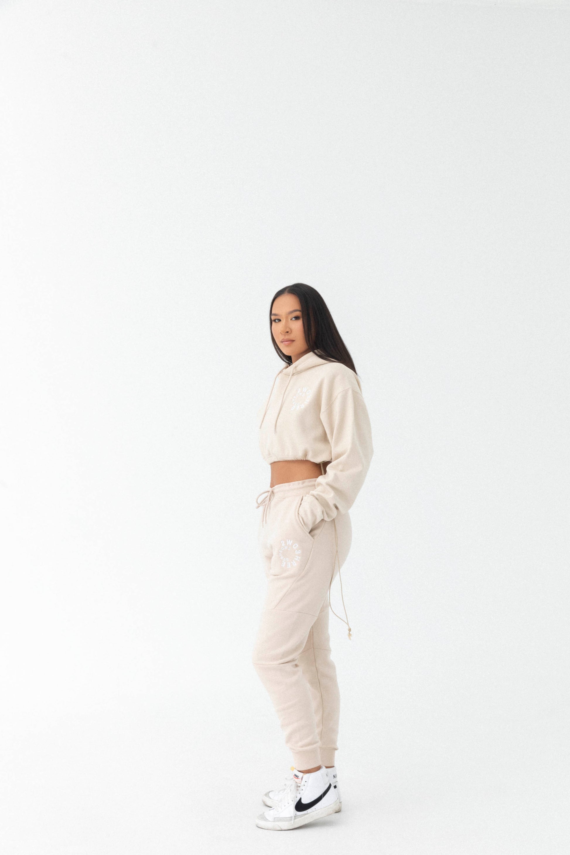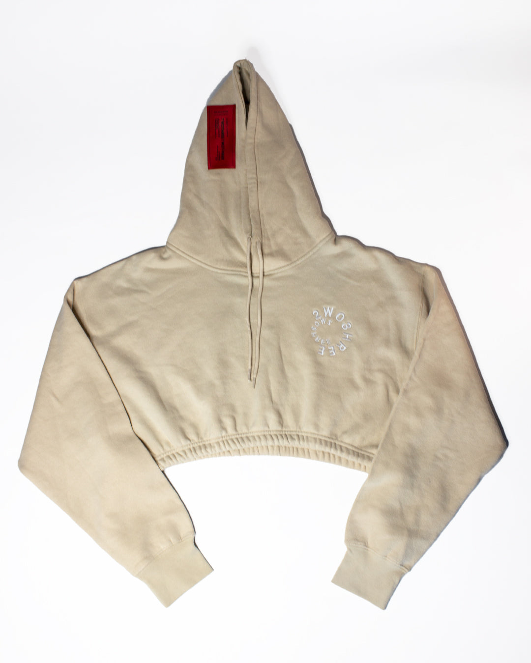 This signature core collection piece is detailed with custom cream/white embroidery. With a uniquely designed crop and two panel hoodie, this is an ultimate staple that redefines comfortability. Adjustable matching tone cord stoppers, 1 1/2 inch elastic, and state of the art stitching that attaches our authentic woven labels. Find peace within this timeless garment.